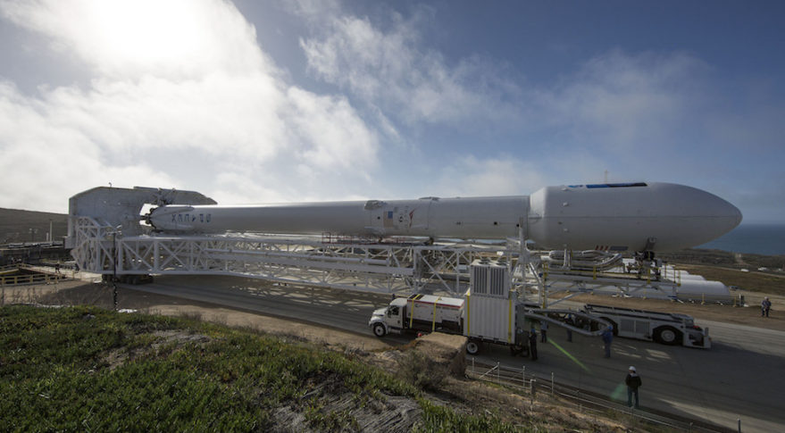 The April 27 award of an $82.7 million U.S. Air Force contract to launch a GPS-3 satellite gives SpaceX and its Falcon 9 rocket (shown above rolling out for the January launch of Jason-3) an important foothold in the national security launch market. Credit. SpaceX