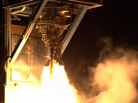 Merlin Vacuum (MVac) engine firing on the test stand in Texas. Like the smaller engine on our