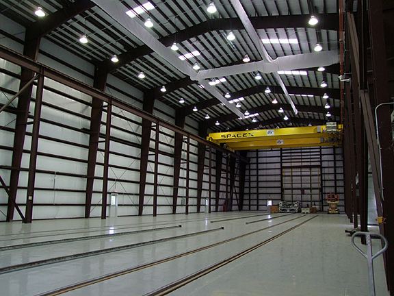Interior of the vehicle integration building showing the massive overhead crane system,