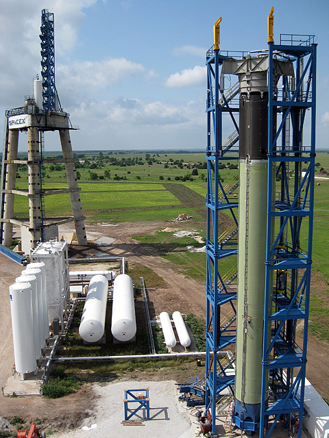 Falcon 9 first stage and interstage (right) on the structural test stand in Texas.