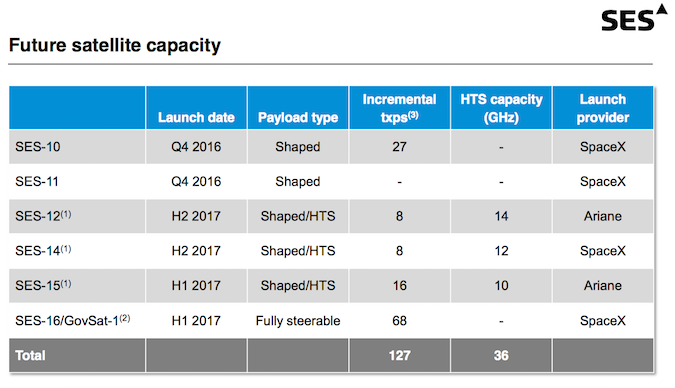 Four of the next six SES satellites will launch on SpaceX Falcon 9 rockets. SES has ordered another new satellite, SES 17, since releasing this graphic, but a launcher has not been contracted for that mission. Credit: SES