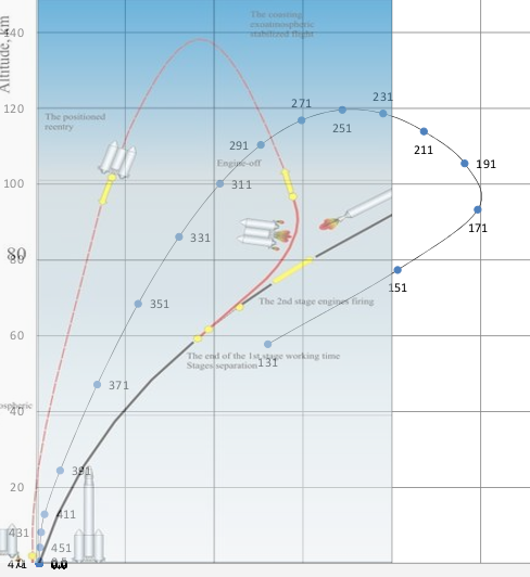 Обратите внимание, что шкала дальности и высоты одинаковая. То есть "Россиянка" залетает гораздо выше чем дальше. Тормозной импульс направлен по горизонтали, и вертикальная компонента скорости забрасывает ступень на сотню километров.