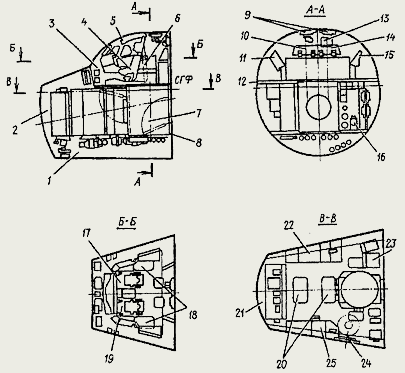 1-агрегатный отсек; 2- бытовой отсек (БО); 3- командный отсек (КО); 4,6- катапультные кресла (в посадочном и стартовом положениях); 5- люк для катапультирования; 7- шлюзовая камера кабины; 8- нижний пол; 9- верхние иллюминаторы; 10,11- рабочие места РМ-4 и РМ-3; 12- верхний пол; 13- задний иллюминатор; 14,15- рабочие места РМ-5 и РМ-6; 16- ассенизационно-санитарное устройство; 17,19- рабочие места РМ-2 (летчика) и РМ-1 (командира); 18- переходные люки из БО в КО; 20- эксплуатационные люки; 21,22,23- приборные отсеки ПО-1, ПО-7 и ПО-2; 24- входной люк; 25- буфет