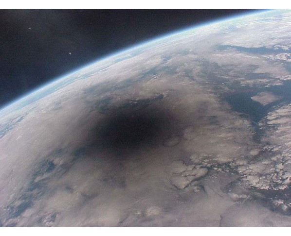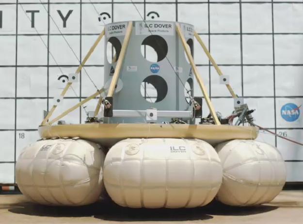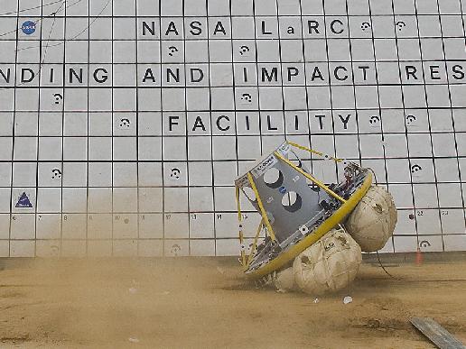 The ILC Dover ground test article lands at the base of NASA Langley's gantry after one of the most severe airbag drop tests conducted this year. Langley engineers dropped the ground test article from 25 feet high at a 10-degree "toe in" pitch angle.