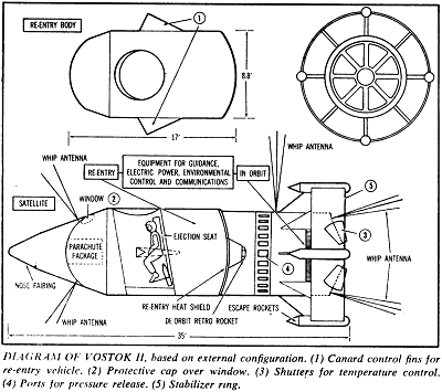 ЦитироватьНекоторые сведения о корабле удалось получить, изучая модель «Востока», которая демонстрировалась в июле 1961 года во время воздушного парада Тушино. Конус головного обтекателя по-прежнему скрывал детали конфигурации, однако экспертам удалось увидеть люк, через который советский космонавт осуществлял катапультирование. Впрочем, макет добавил и вопросов. Так, к задней части конуса был прикреплен аэродинамический стабилизатор, что привело к самым различным толкованиям его назначения в подлинной конфигурации «Востока».