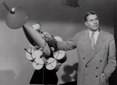Wernher von Braun with his design for a rocket to take man to the moon, in the 1950s Disney film "Tomorrow the Moon." :P