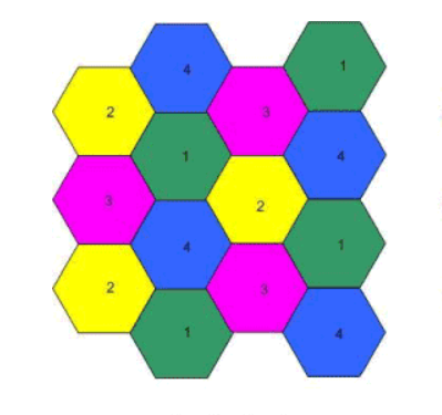 Обычно делят на 4 полосы. И располагают их в виде СОТ. Тогда получается что при четырех частотах у тебя соседние соты никогда по частоте не пересекаются. Благодаря этому одной частотой можно пользоваться в разных сотах, для разных клиентов. Но поскольку соты с одной частотой друг от друга далеко, то они не мешают друг другу.