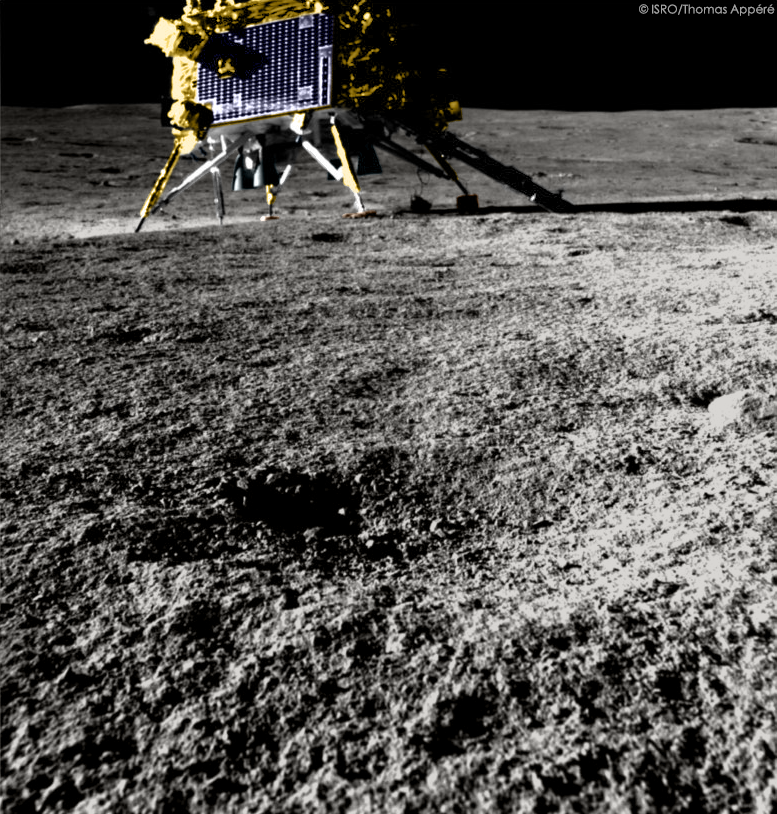По просьбе нескольких пользователей интернета я также раскрасил поверхность на этом снимке посадочной платформы "Викрам", сделанном ровером "Прагъян". За основу я взял цвет поверхности с фотографий Apollo.