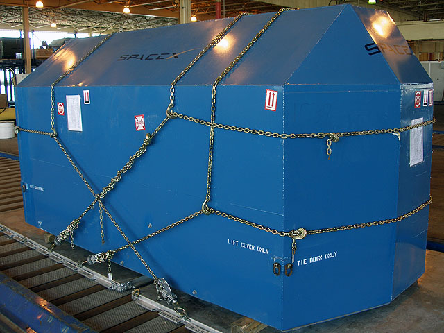 The second stage's shipping container chained securely before it was loaded onto the aircraft for a trans-Pacific flight.