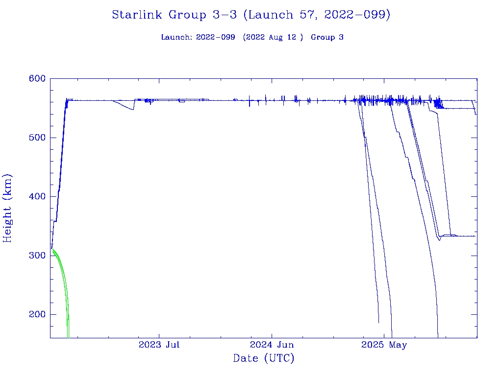 Эта группа Старлинков не сильно удачлива. Два спутника сведены с орбиты в 2024 году, три в 2025-м и ещё два сейчас находятся в стадии интенсивного сведения на двигателях.
