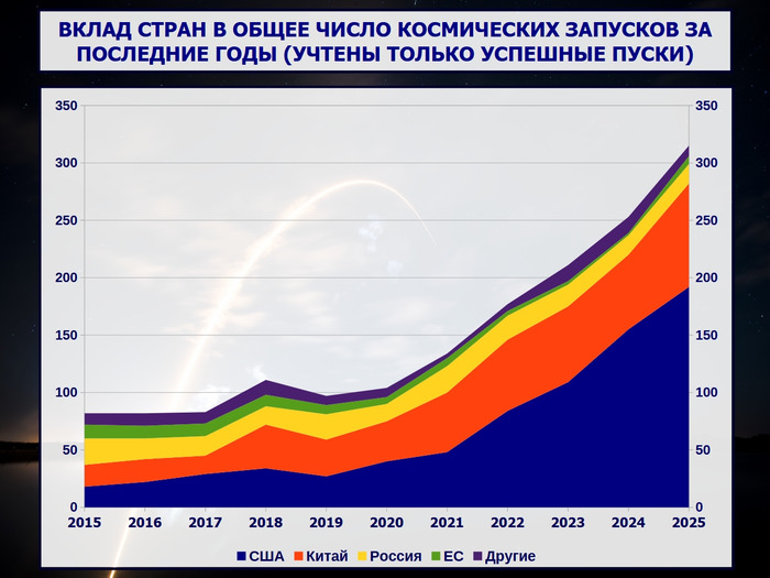 Число запущенных ракет-носителей растёт год от года уже пять лет подряд. По сравнению с 2024 годом их число в 2025 году выросло на 64 единицы. Прирост этого показателя составил 24,7%. Хотя ожидался меньший рост, на уровне 10-15%. Но все прогнозы оказались заниженными по сравнению с реальностью.
