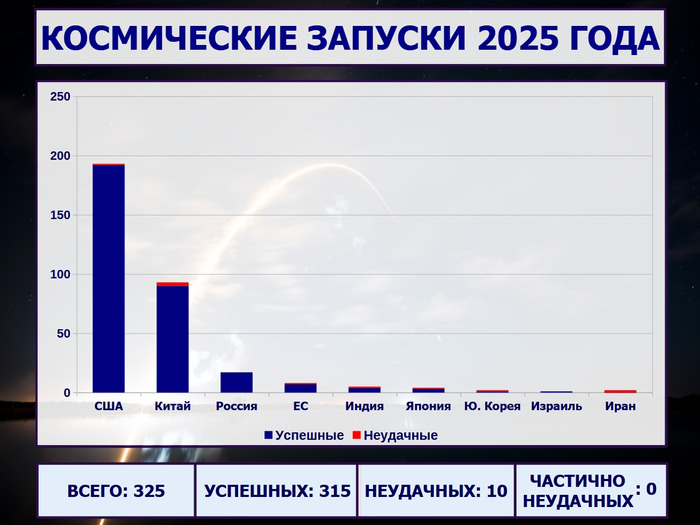 В минувшем году в различных странах мира стартовали 323 ракеты-носителя, целью которых был вывод на околоземную орбиту полезной нагрузки различного назначения. Из этого числа 315 пусков были успешными (или частично-успешными), остальные закончились авариями на участке выведения (2,47% от общего числа).