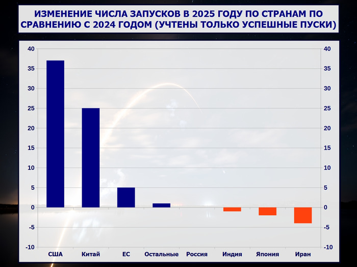 • Значительное увеличение числа космических запусков. 2025 год побил рекорд предыдущего года по их числу, а декабрь стал рекордным месяцем по числу пусков за всю историю космонавтики. Однако основной прирост приходится на США и Китай (см. статистику).