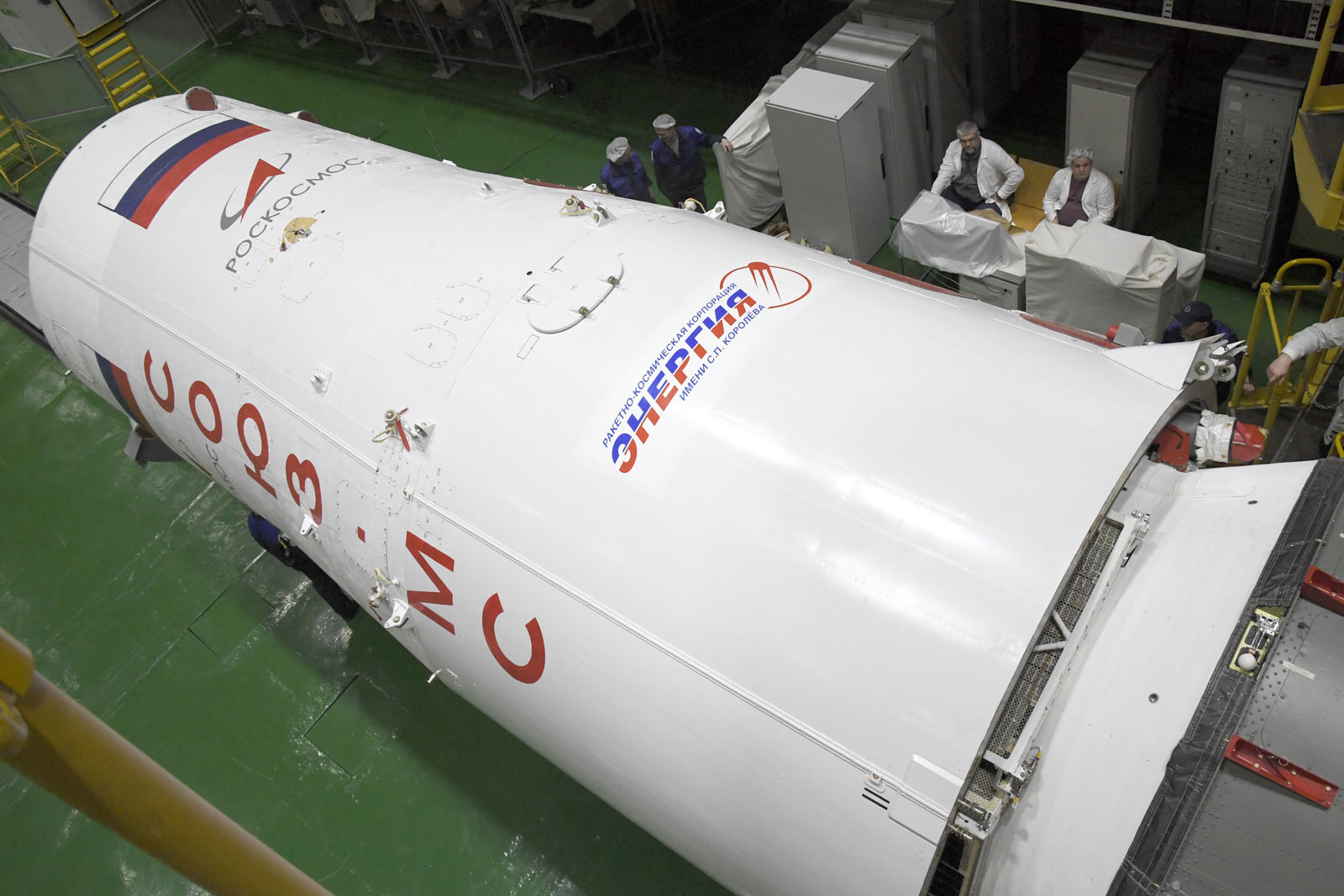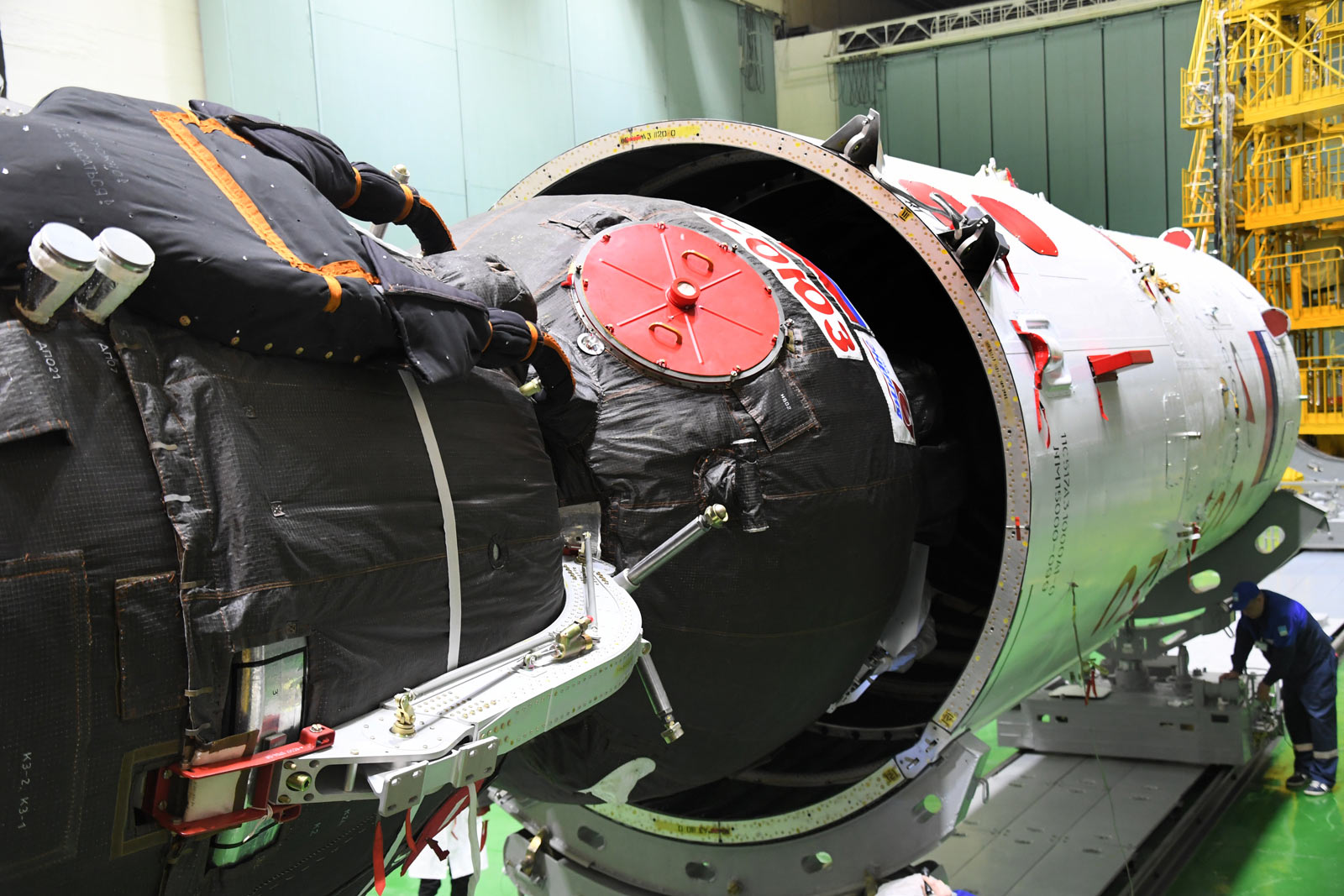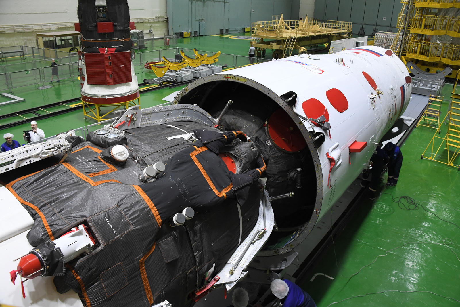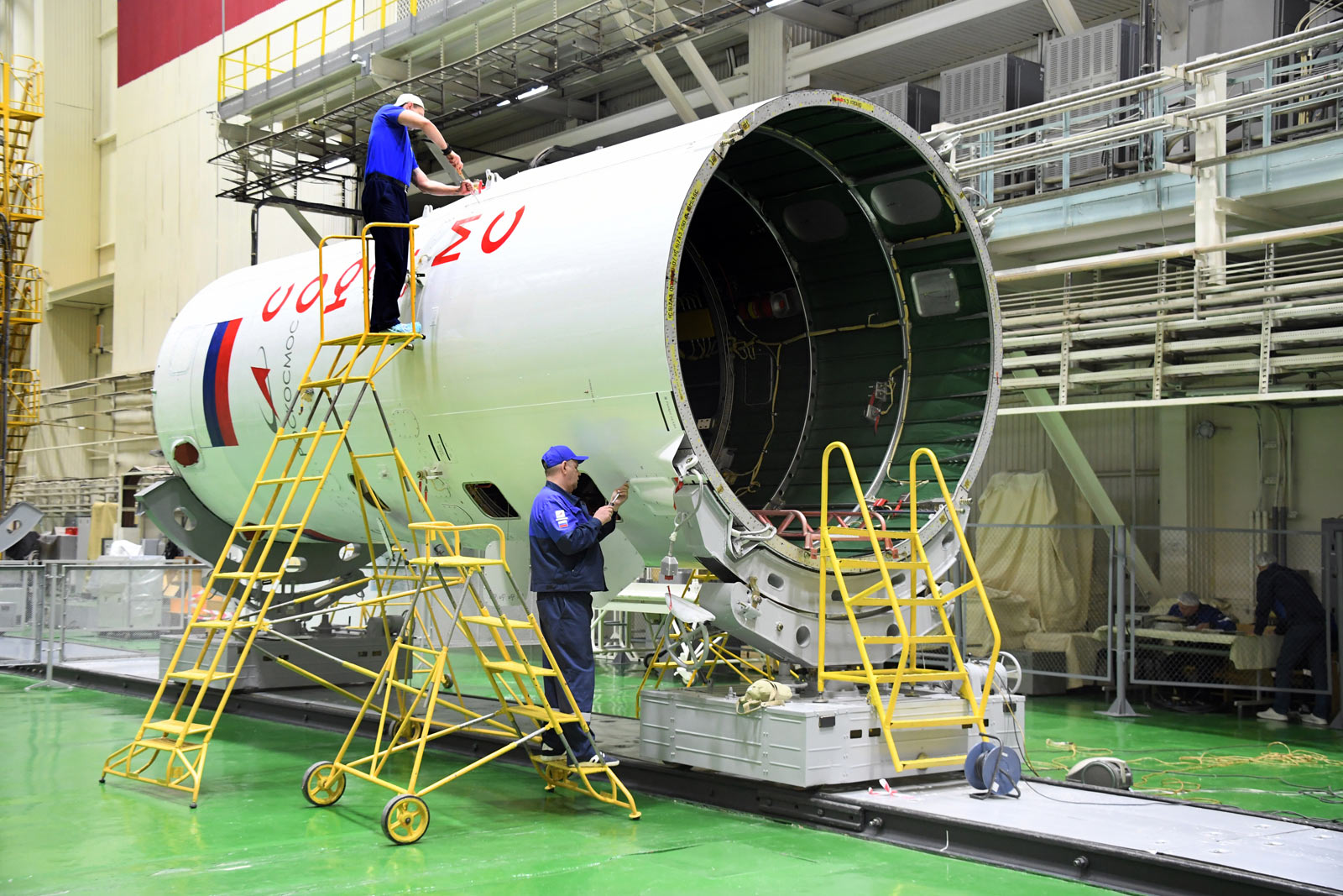 Сегодня в монтажно-испытательном корпусе 254-й площадки космодрома Байконур специалисты Ракетно-космической корпорации «Энергия» имени С.П. Королева и других предприятий Госкорпорации «Роскосмос» провели авторский осмотр беспилотного корабля «Союз МС-23» и выполнили накатку на него головного обтекателя.
