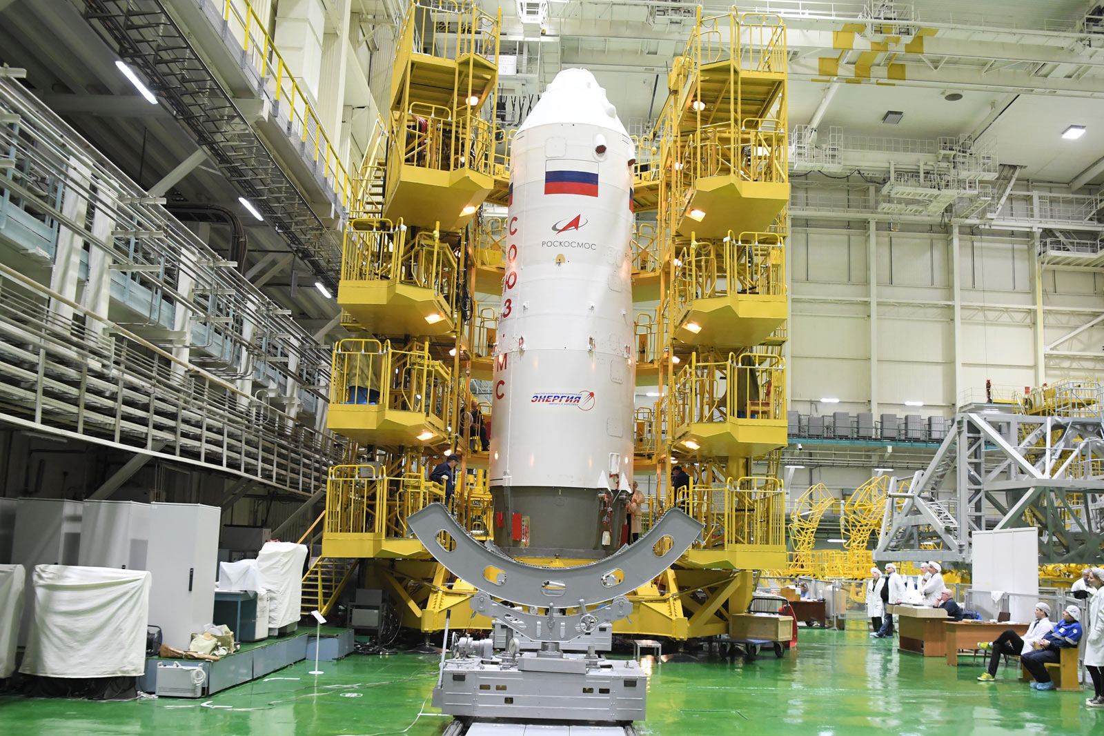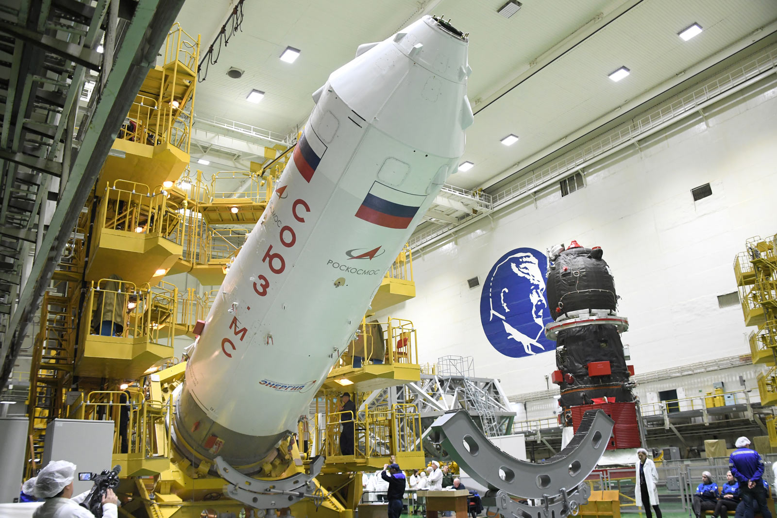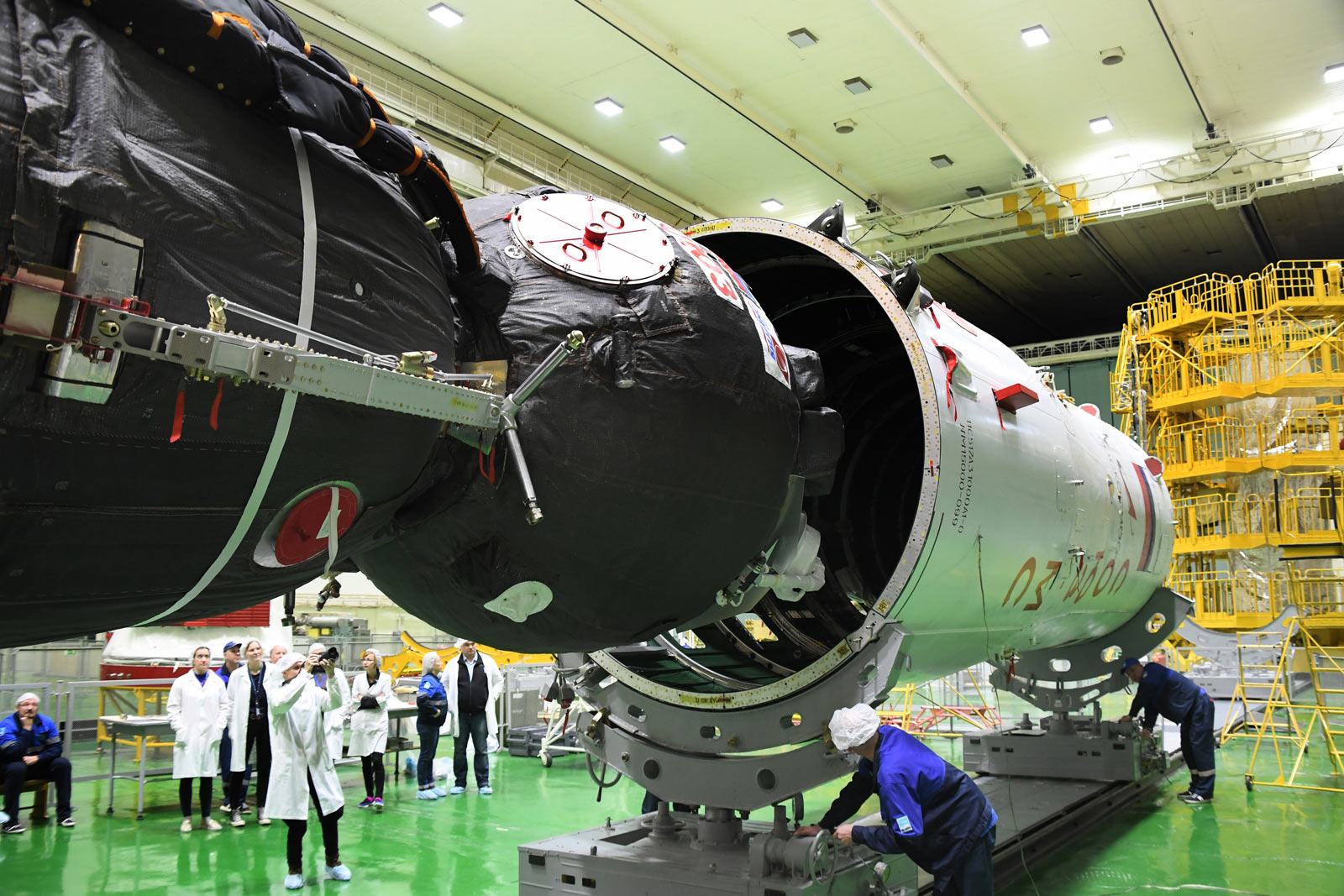 Сегодня в монтажно-испытательном корпусе 254-й площадки космодрома Байконур специалисты Ракетно-космической корпорации «Энергия» имени С.П. Королева и других предприятий Госкорпорации «Роскосмос» провели авторский осмотр беспилотного корабля «Союз МС-23» и выполнили накатку на него головного обтекателя.