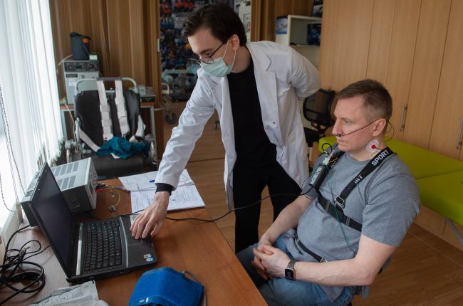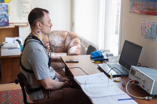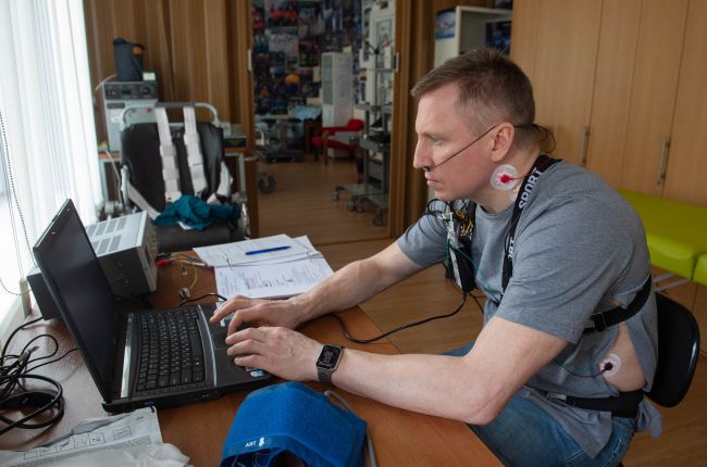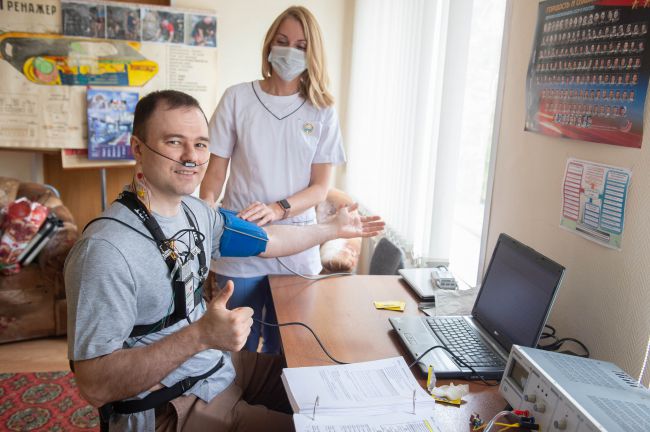 С момента возвращения на Землю у Сергея Прокопьева и Дмитрия Петелина прошло три сеанса космического эксперимента «Кардиовектор». Процесс занимает около часа. Все это время ведется запись физиологических показателей космонавта. «Вначале снимают параметры в состоянии покоя: кардиограмму, давление, пульс, - рассказал космонавт Дмитрий Петелин. - Далее – дышишь по заданному ритму, периодически ускоряя или замедляя дыхание, максимально задерживаешь его на вдохе и выдохе».