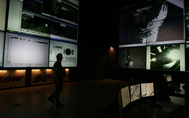 Кто сказал что у них нет наземки? Есть красивый просторный зал. И гостей приглашают не на тесный балкон, а на большой танцпол прямо к операторам погулять и посмотреть на огромные экраны. Чтобы посетители не дергали за рычаги управления рабочие места операторов закрыты с боков.