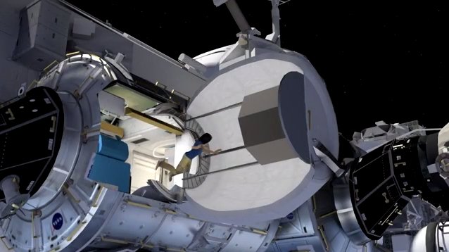 Animation of the Bigelow Expandable Activity Module's extraction and installation on the International Space Station.