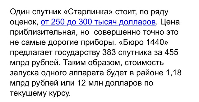Справедливости ради - цена 200-300 тыс. за спутник Старлинка - это за железо, без стоимости разработки и пусковых затрат.
