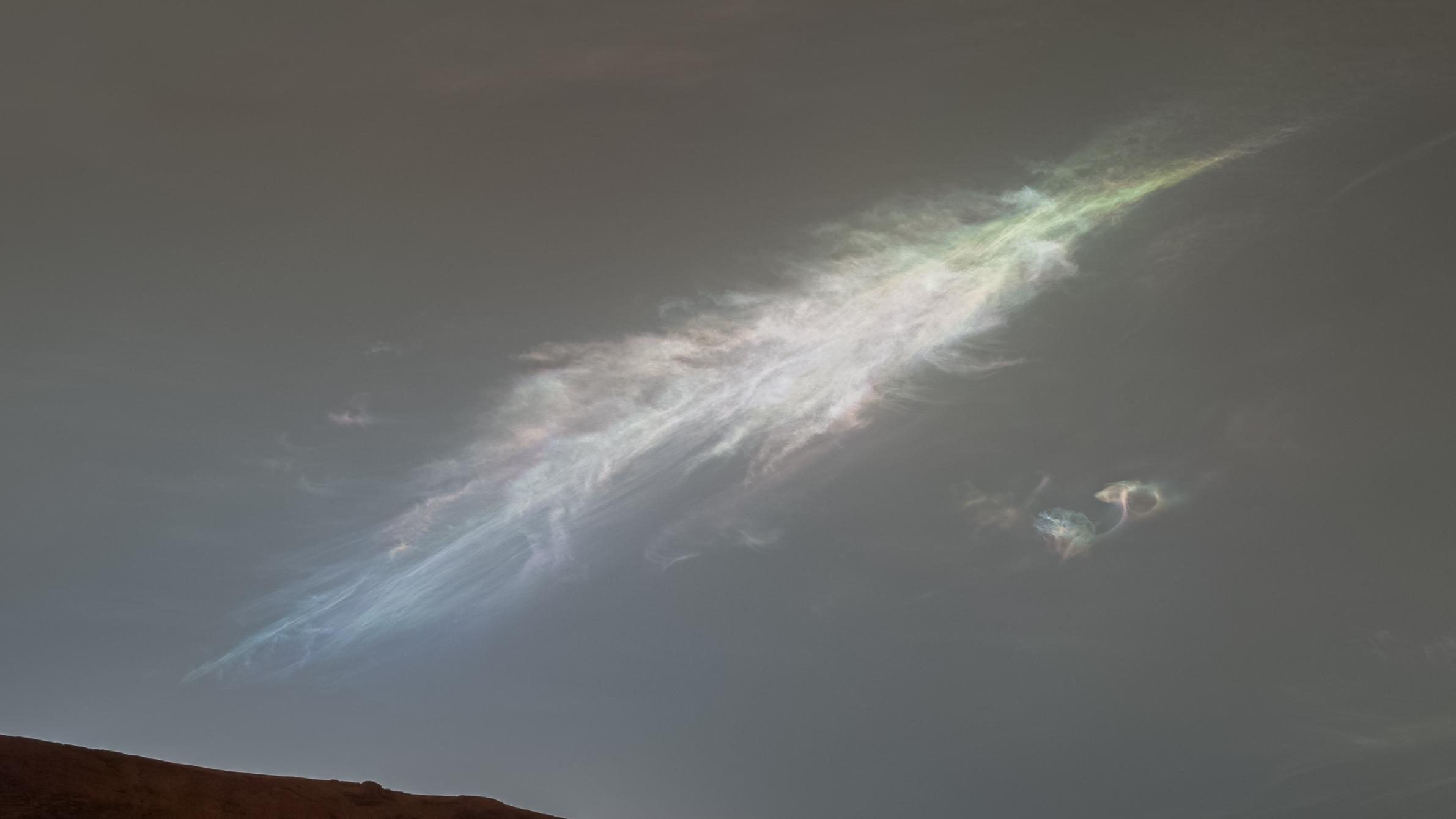 Два года назад марсоход НАСА Curiosity запечатлел это перьевое переливающееся облако после захода солнца. Цвет создается благодаря эффекту дифракции, когда солнечный свет рассеивается мелкими частицами CO2 в облаке.