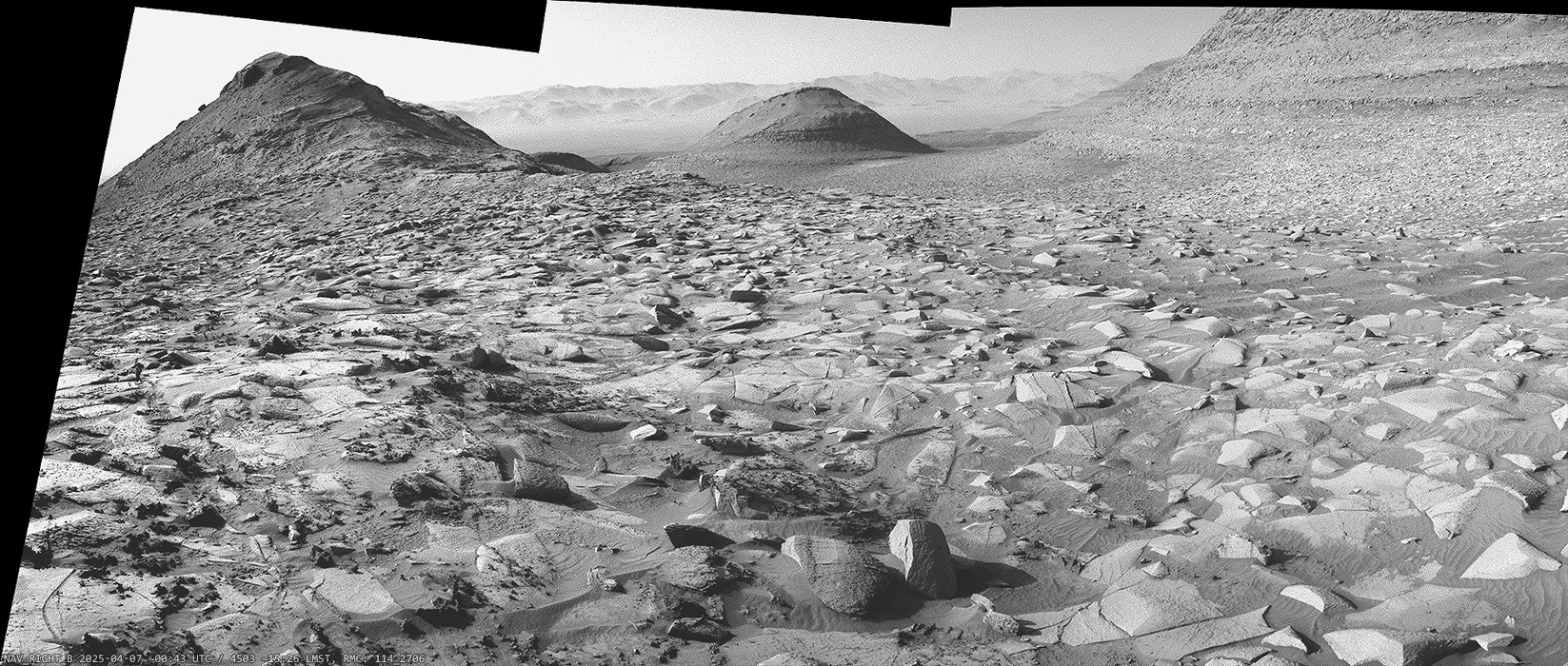 Этот снимок был сделан левой навигационной камерой на борту марсохода НАСА Curiosity во время сол 4503 (2025-04-07 00:33:50 UTC).