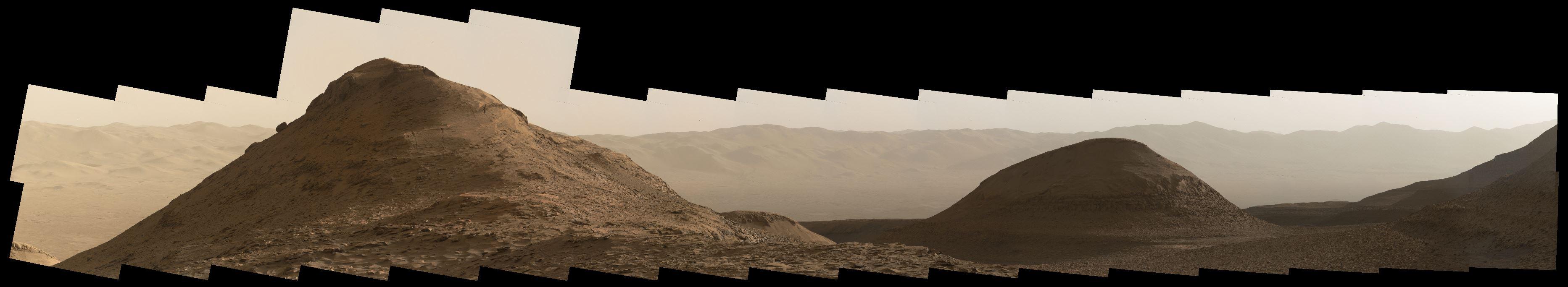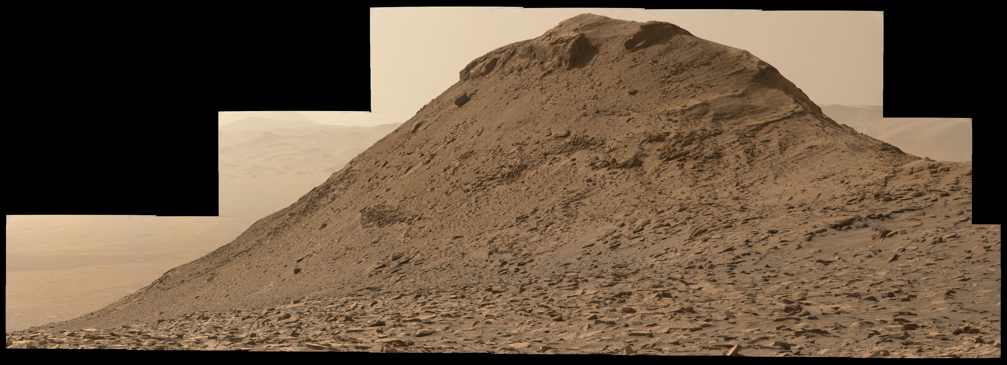 (butte), окрашенного в охристые тона. На заднем плане видна стена обода кратера Гейла на расстоянии 10 километров. Изображения были сделаны научной камерой Mastcam марсохода Curiosity.