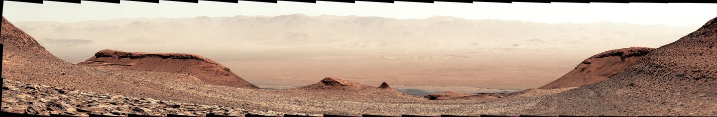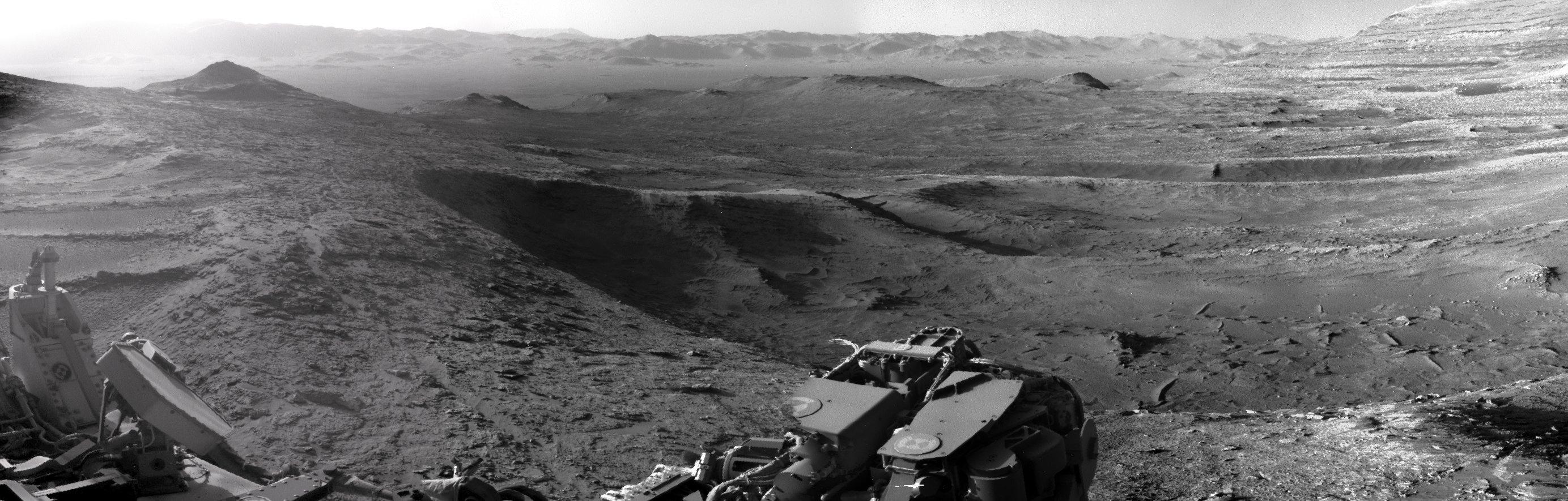 #PPOD: Этот вид с марсохода НАСА Curiosity, сшитый из 28 снимков, был сделан после того, как марсоход поднялся по крутому склону геологического объекта под названием «Педимент Гринхью» - "Greenheugh Pediment" ( как вариант: "Фронтон Гринхью"). Вдали, в верхней части снимка, находится дно кратера Гейла рядом с областью под названием "Эолис Дорса" - "Aeolis Dorsa", которая, по мнению исследователей, когда-то была огромным океаном. Credit: NASA/JPL-Caltech/MSSS