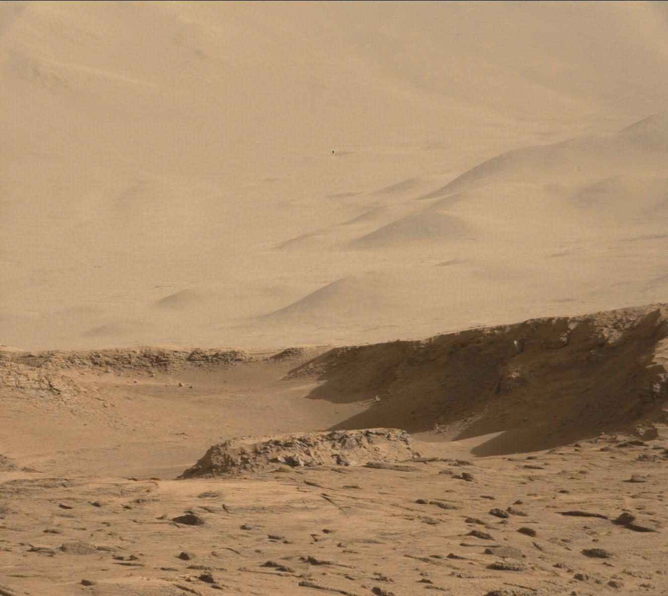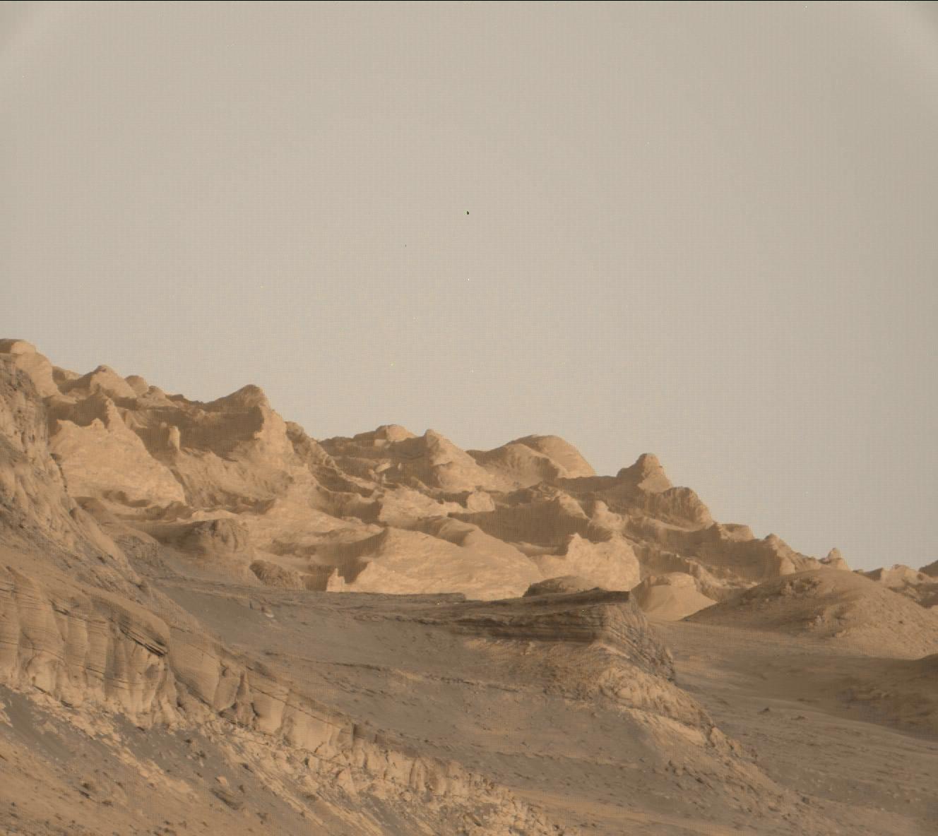 Цитировать....  ChemCam собрал три изображения (с помощью) RMI с большого расстояния, которые помогут оценить слои у основания холма «Мише Моква», завершить съёмку близлежащих каркасных конструкций, а также получить изображения очень удалённого края кратера (примерно в 90 километрах, или 56 милях, от нас) и неба, чтобы исследовать свойства рассеивания атмосферы. Группа по изучению окружающей среды включила в программу наблюдений измерения свойств атмосферы, а также съёмку пылевых вихрей.