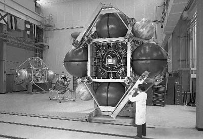 Форма обычная для стабилизированного вращением аппарата. Так расположены баки на всех стабилизированных вращением спутниках. Тот же 376-й. Цилиндрические баки не могут быть - при вращении топливо отбросит к стенкам. Вообще у американских стабилизированных вращением спутников длина существенно меньше описаной окружности. Таково условие стабильности вращения. И только на "раздвижных" аппаратах типа 376-го это правило нарушается.
