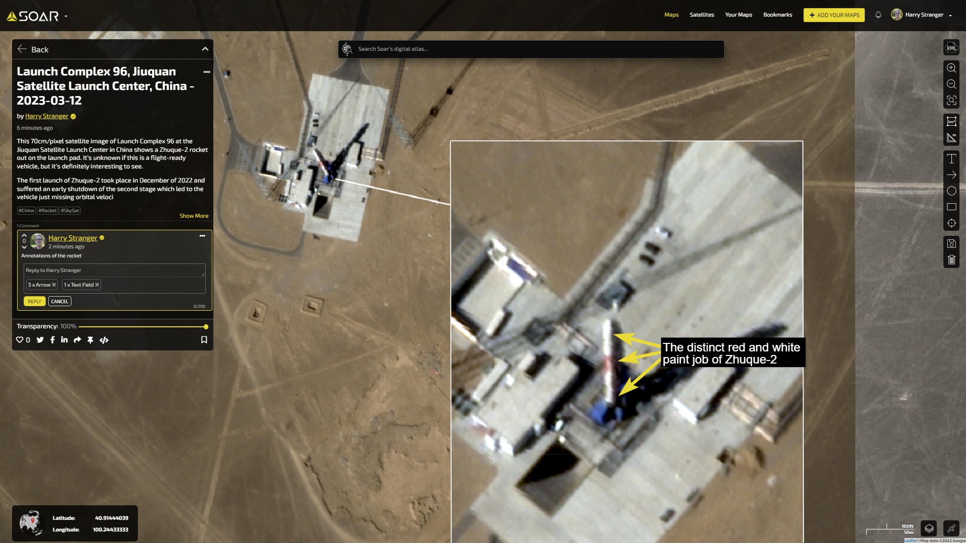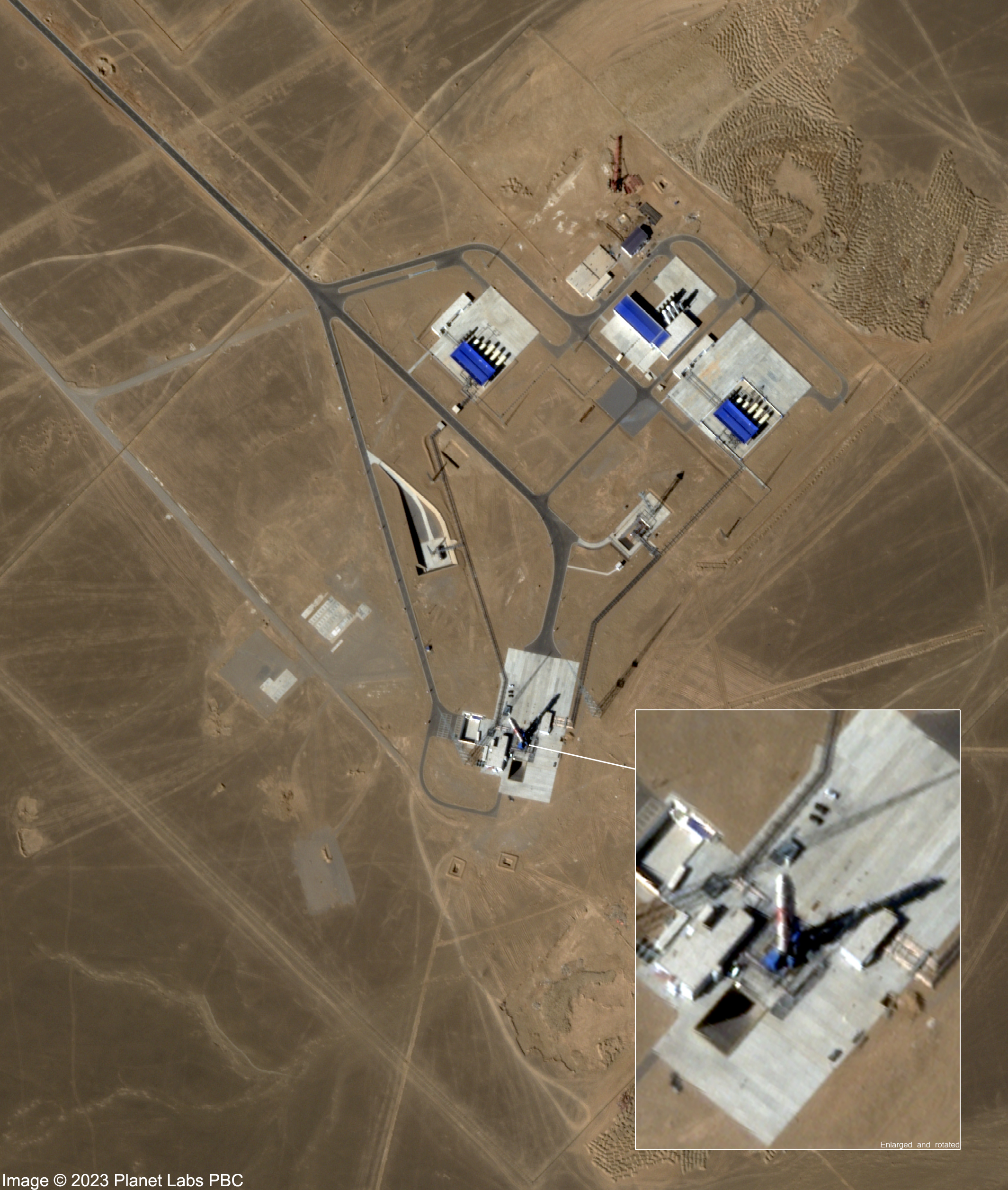 70cm/pixel satellite imagery taken on 2023-03-12 shows a Zhuque-2 rocket on the pad at Jiuquan SLC in China.