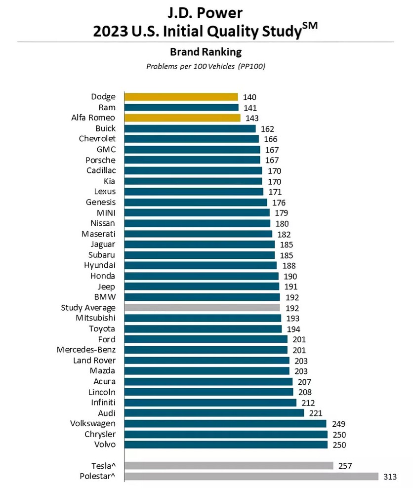 Цитата: nonconvex от 09.10.2023 07:30:20Занятная картинка. Тесла в лидерах по количеству дефектов.