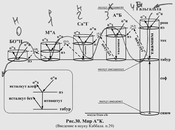 Каббалисты в своих постижениях поднимаются на более высший уровень реальности, вне времени и пространства и оттуда уже исследуют наш мир и все остальное. Для того, чтобы понять определенный уровень, нужно подняться на следующий, более высокий. Материальная вселенная находится на самом низшем уровне, в каббале она так и определяется - как самый худший из миров, черная точка в центре зияющей пустоты. Более поэтическим языком нежели научным это описывает великий каббалист АРИ, своего рода сокращенная форма сути каббалы.