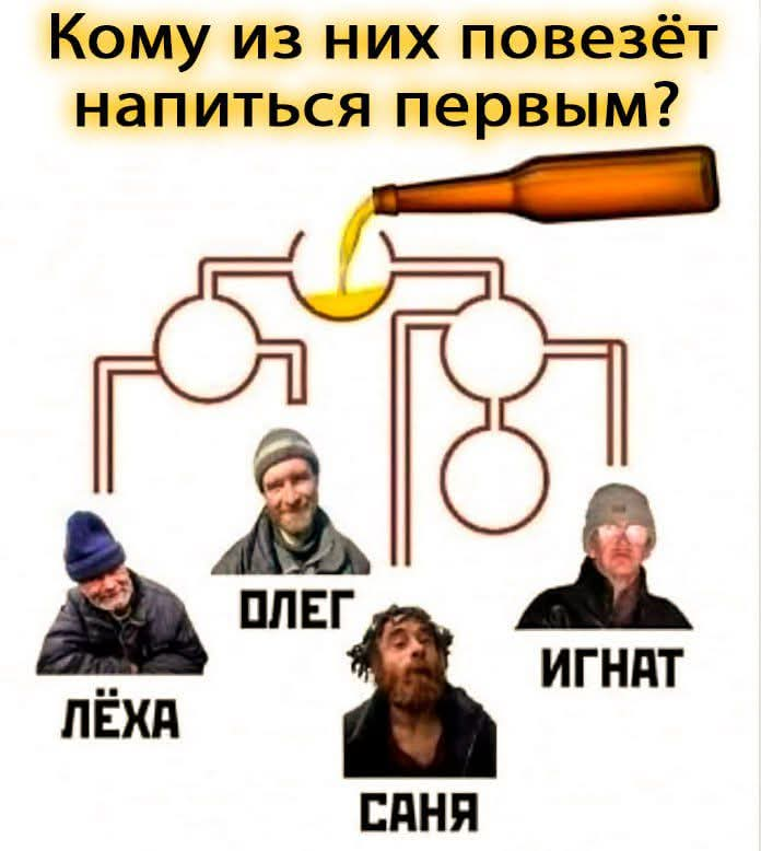 ЦитироватьХа-ха, интересный вопрос! На картинке изображены четыре человека — Лёха, Олег, Игнат и Саня, — и бутылка, из которой что-то разливается. Судя по схеме, похоже, что "первым" напьётся тот, кто ближе к началу "потока". Если следовать логике разлива от бутылки, то первым, скорее всего, будет Олег, так как он первый в цепочке после разлива. Но это, конечно, шутка — всё зависит от того, кто первый схватит бутылку в реальной жизни! 😄 Что думаешь?