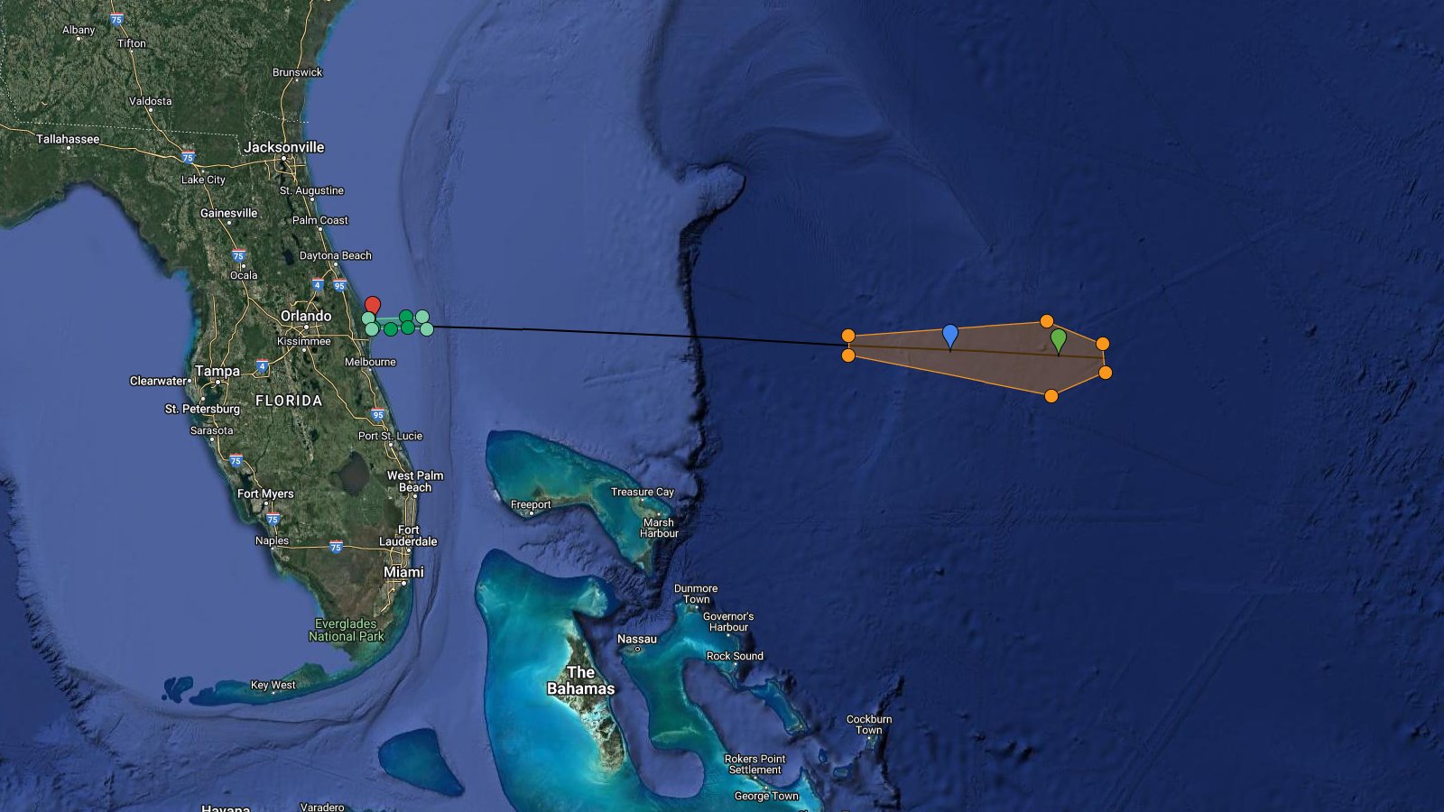 Launch Hazard Areas for #MPOWER-B mission from CCSFS SLC-40, valid for NET 28 Apr 21:12 UTC, altern.29 Apr to 04 May based on issued NOTMAR/NOTAM. Booster landing 690km downrange. Estimated fairing recovery position approx. 819km downrange. https://bit.ly/LHA-25