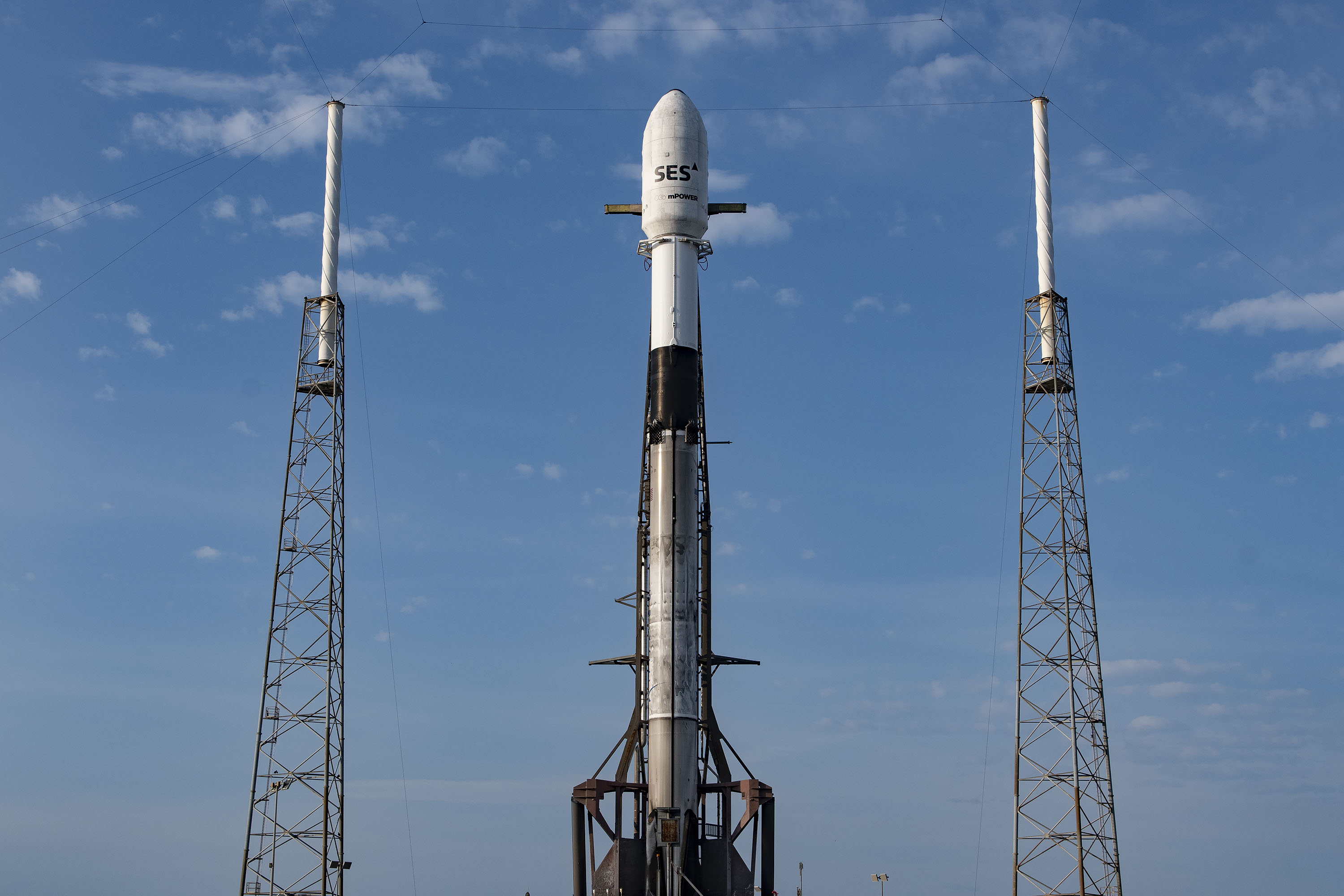 Falcon 9 went vertical early this morning on SLC-40 ahead of today's targeted launch of the @SES_Satellites O3b mPOWER mission → http://spacex.com/launches