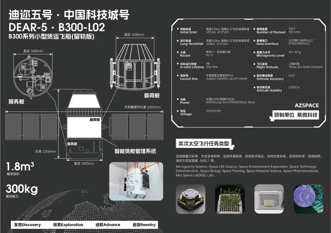 Космический экспериментальный аппарат "Диэр-5" /DEAR-5/ -- это грузовая космическая платформа, разработанная коммерческой космической фирмой AZSPACE, которая находится в Пекине. Он обладает грузоподъемностью 300 кг и позволяет выполнять орбитальные операции в течение одного года, а также отправлять обратно экспериментальные данные.