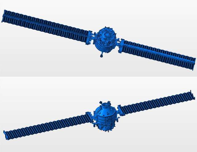 сделал обе солнечные батареи (отечественную МСБ и "кооперативную"). Так же обвешал корпус деталями по имеющимся фото.