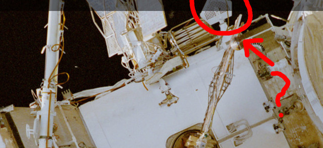 По верху - уточнить бы по креплению фермы солнечных батарей? Что за стопка рядом с ними? сменные панели? И что за штуковина с пятиконечной панелькой?