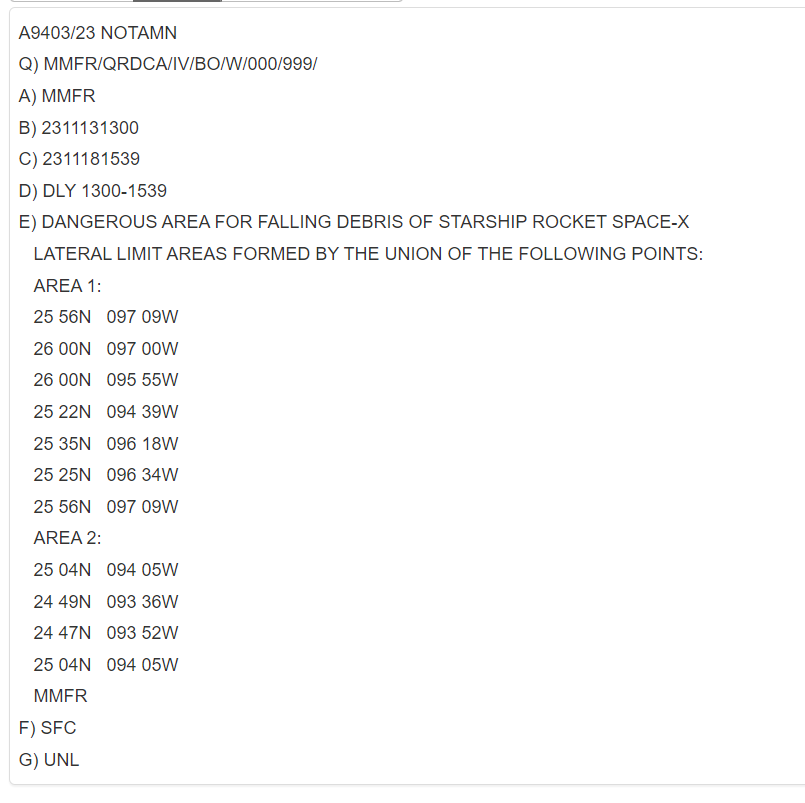 Появилось уведомление для моряков на даты с 13 по 18 ноября ежедневно. Время для района в Мексиканском заливе с 13:00 до 15:39 UTC (но 18 ноября с 13:00 до 13:49 UTC).