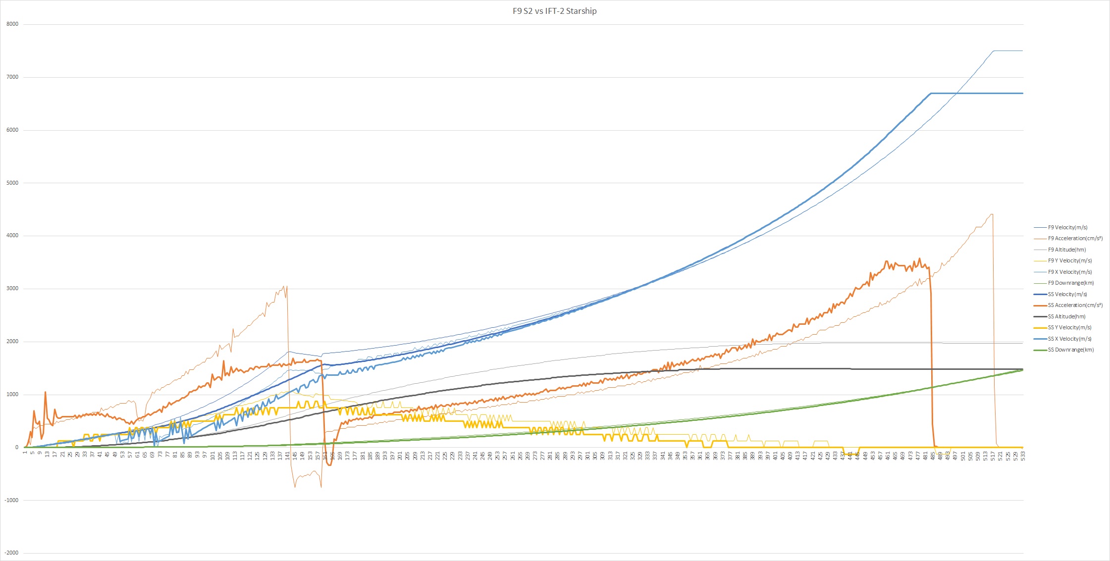 Провели предварительный анализ телеметрии - с первым пуском сравнивать нет смысла, ускорение везде в полтора раза выше.  Достойно смотрится на фоне Ф9. Довольно заметный провал на MaxQ, возможно, имеет смысл складывать рули, но возможно, что и специально снизили тягу, чтобы не смять обтекатель.
