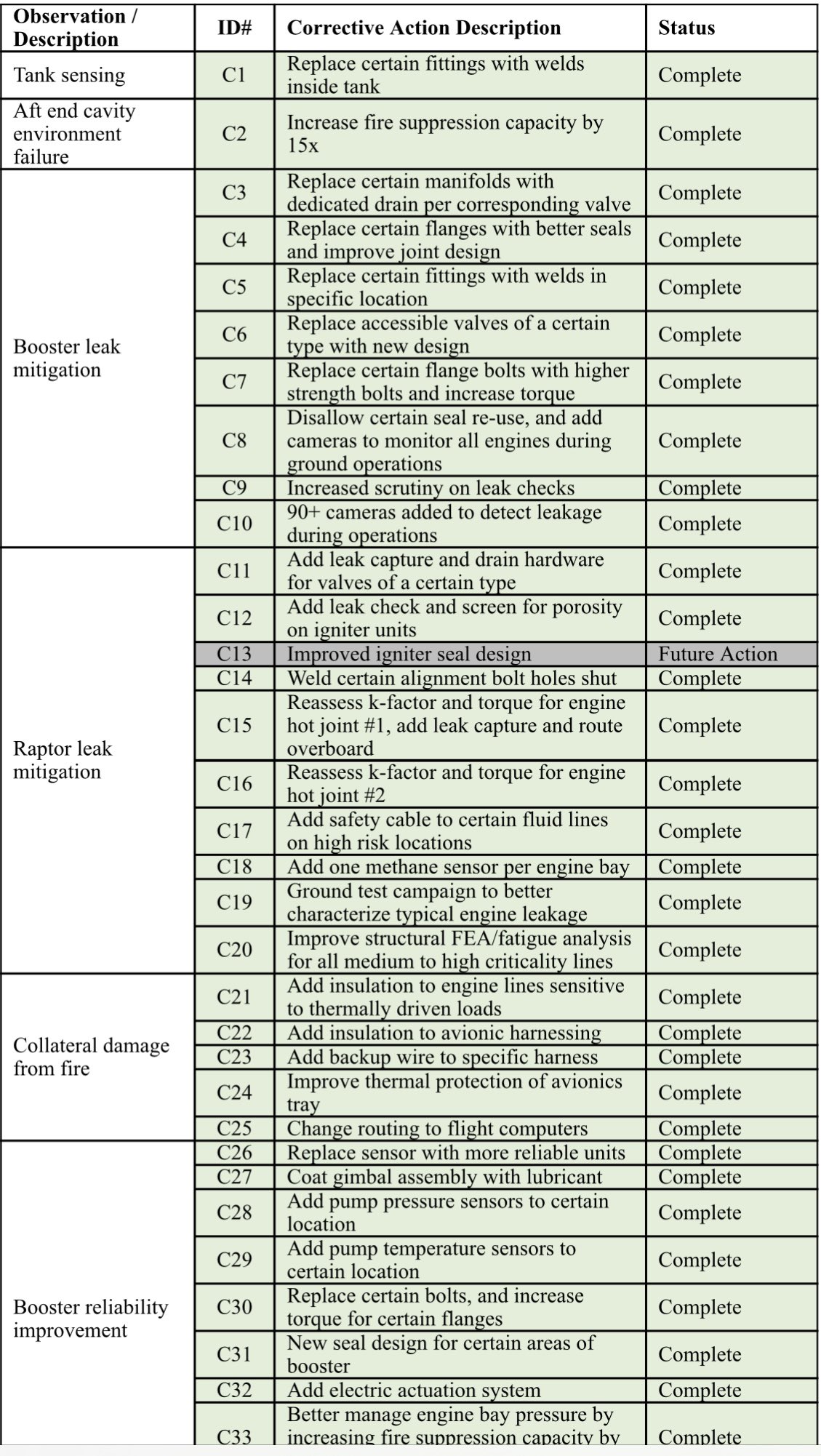 По итогам первого полета было предложено 10 исправлений для борьбы с утечками в Рапторах. Но текут не только двигатели. В списке было также 8 исправлений, относящихся к системе подачи топлива в бустере: