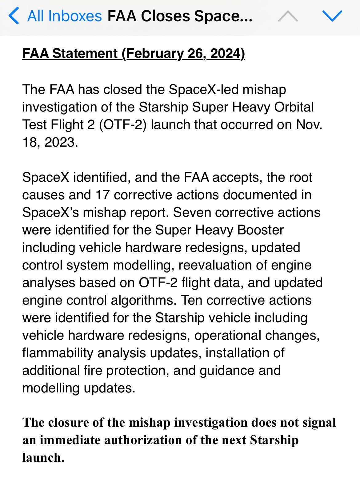 Цитата: Шлангенциркуль от 27.02.2024 02:40:11FAA has closed the mishap investigation for IFT-2.