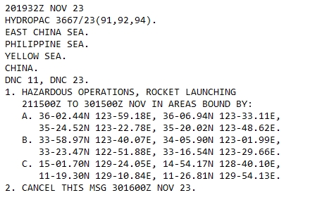 Насчет окна запуска -- ошибка. NOTAM'ы выданы на период 21.11.2023 15:00 UTC по 30.11.2023 15:00 UTC, то есть на девять полных суток, с 22 по 30 ноября, по пхеньянскому времени.