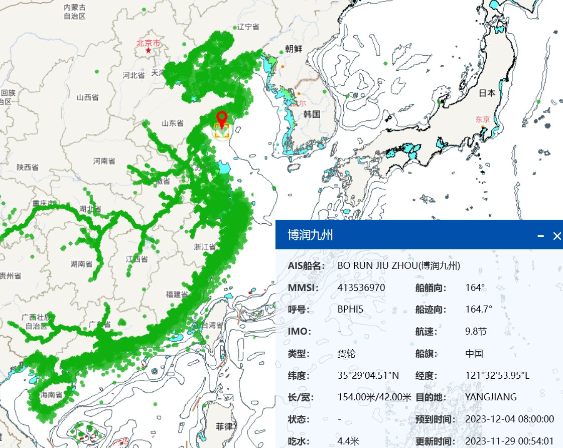 Cargo ship BO RUN JIU ZHOU (MMSI: 413536970) just left Hai Yang port, carrying Smart Dragon 3 to Yang Jiang, Guangdong for launch on December 05 at ~19:30UTC.