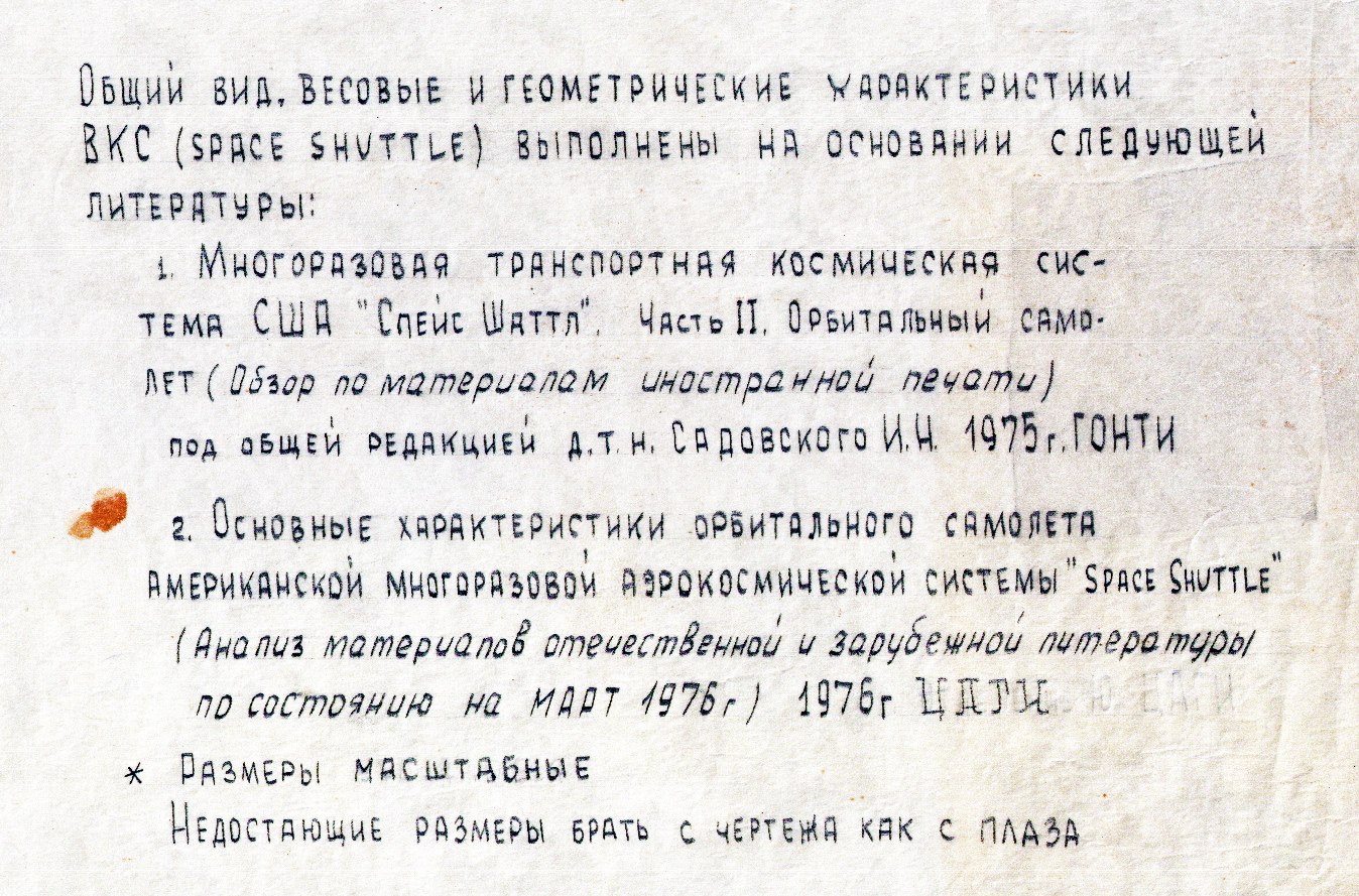 Важность и значение этого чертежа шаттла подтверждают не только подписи главных разработчиков нашего челнока – на поле есть ключевая надпись «Недостающие размеры брать с чертежа как с плаза», говорящая авиационному специалисту о многом. Этот чертеж – основа основ, это самый точный и самый полный чертеж американского шаттла, с геометрией и выверенной весовой сводкой, который был в СССР.