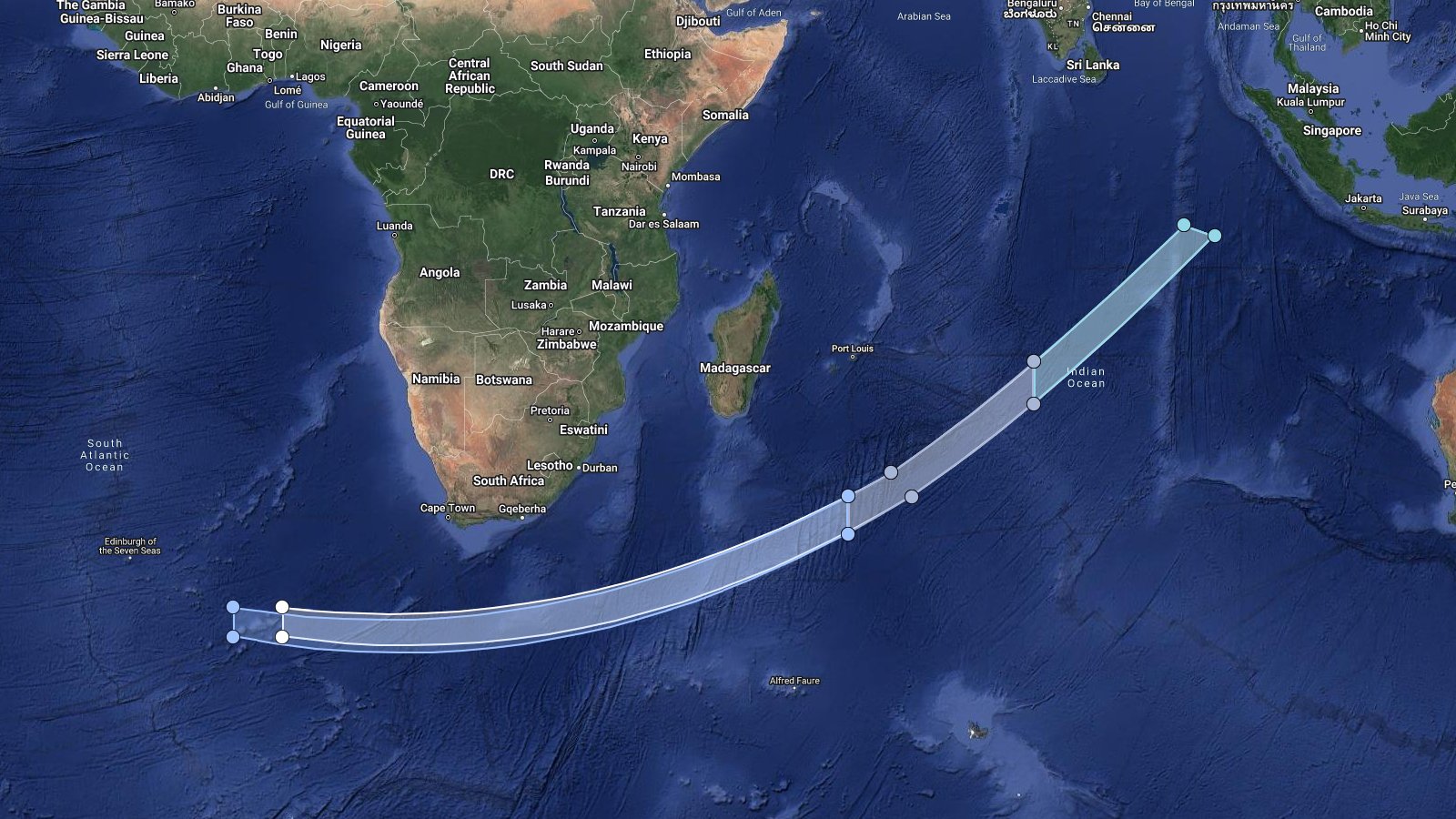LHA map for #Starlink Group 6-30 from CCSFS SLC-40 NET 28 Nov ~04:00 UTC, altern. 29 Nov to 04 Dec based on issued NOTAM/NOTMARs. Estimated booster recovery ~618km with estimated fairing recovery ~678km downrange. S2 debris reentry area in Indian Ocean. http://bit.ly/LHA-31