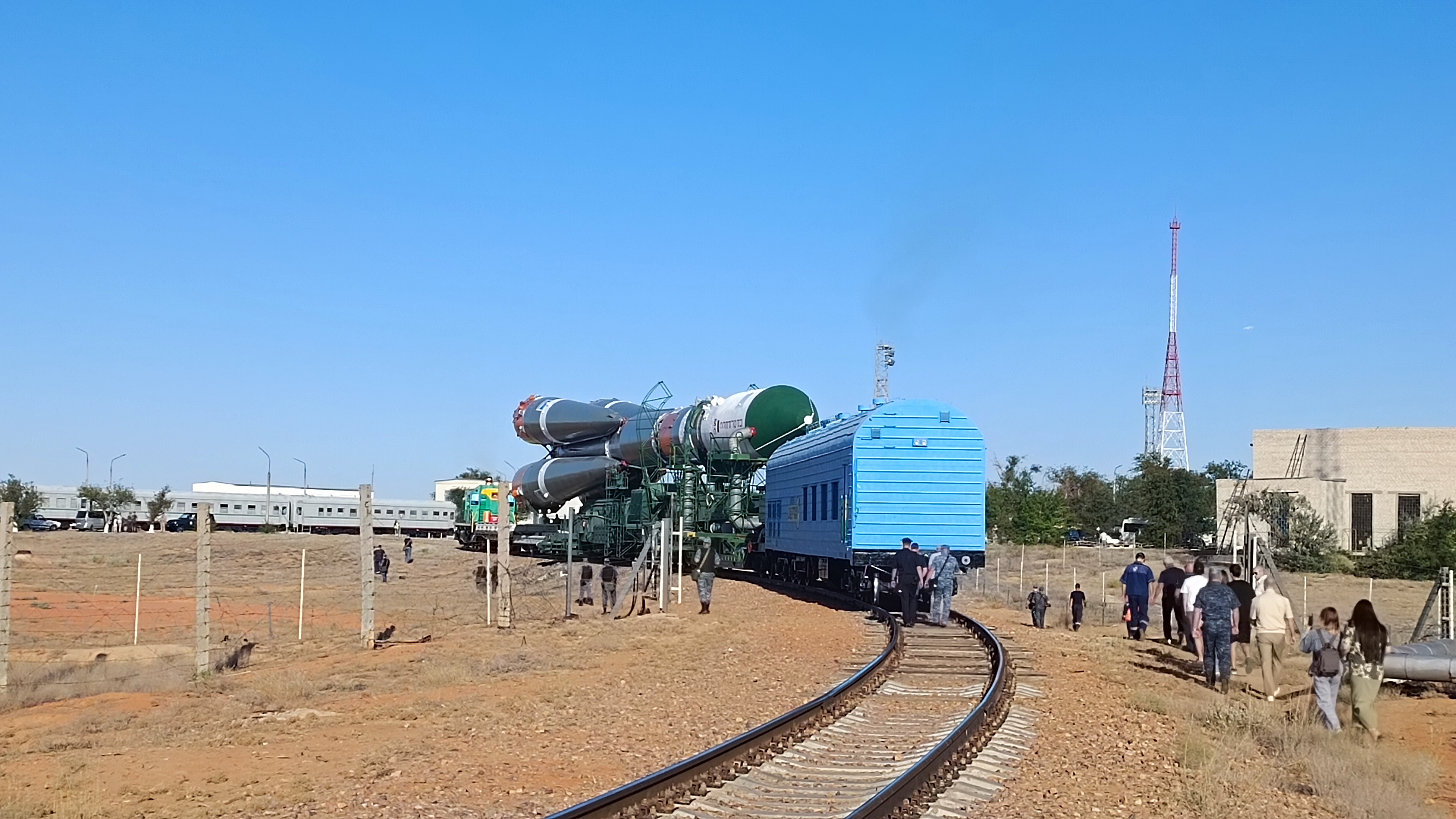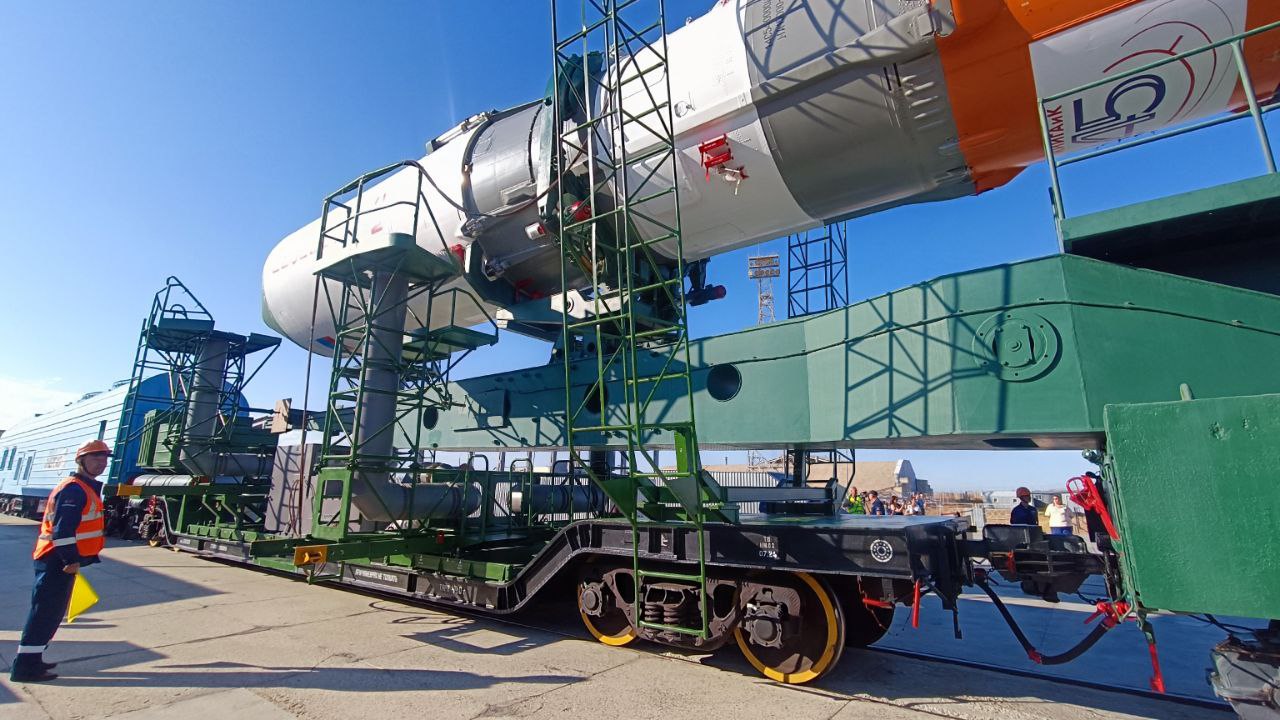 На Байконуре идут последние приготовления к запуску нового грузовика. Перед отправкой корабля с площадки 254 специалисты Роскосмоса выполнили кантование космической головной части в горизонтальное положение и ее погрузку в железнодорожный транспортный агрегат.