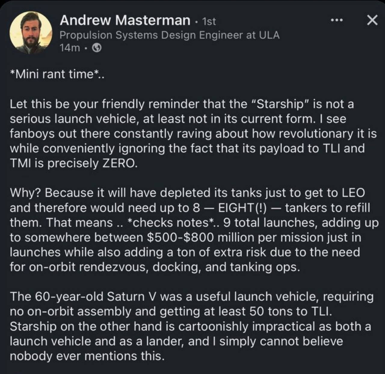 Набросил в данном случае Eric Berger. Это он скопировал в X пост из LinkedIn. Просто как пример высказываний в духе "зелен виноград". Судя по его язвительному комментарию, вряд ли он рассчитывал на разбор написанного. Просто ради лулзов  твитнул, помянув, что когда-то писали ULA про повторное использование первых ступеней.
