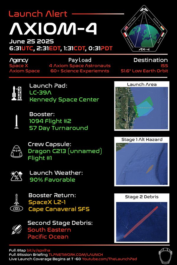 Axiom Mission 4, set to lift off at 2:31 a.m. EDT (0631 UTC) on Wednesday, June 25, is Axiom's fourth private astronaut mission to the International Space Station. Ax-4 is launching from NASA's Kennedy Space Center aboard SpaceX's Dragon spacecraft.