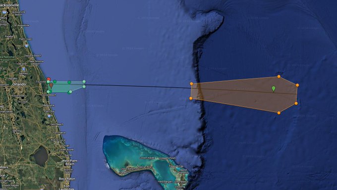Launch Hazard Areas map for #KoreaSat-6A mission from KSC LC-39A valid for NET 11 Nov 17:07 UTC, alternatively 12 to 17 Nov based on issued NOTAM/NOTMARs. LZ-1 landing for B1067.23. Estimated fairing recovery position approx. 573km downrange. http://bit.ly/LHA-43